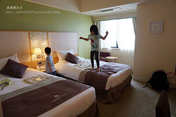 我們在日本的住宿,都是訂兩張單人床Twin(ツイン)的房型,Monterey Grasmere Osaka的兩張單人床房型,每張床有120*203cm大,我們家一大一小睡剛剛好。