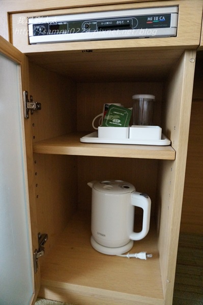電視下方櫃子打開有小冰箱,煮水壺,茶包和咖啡包。