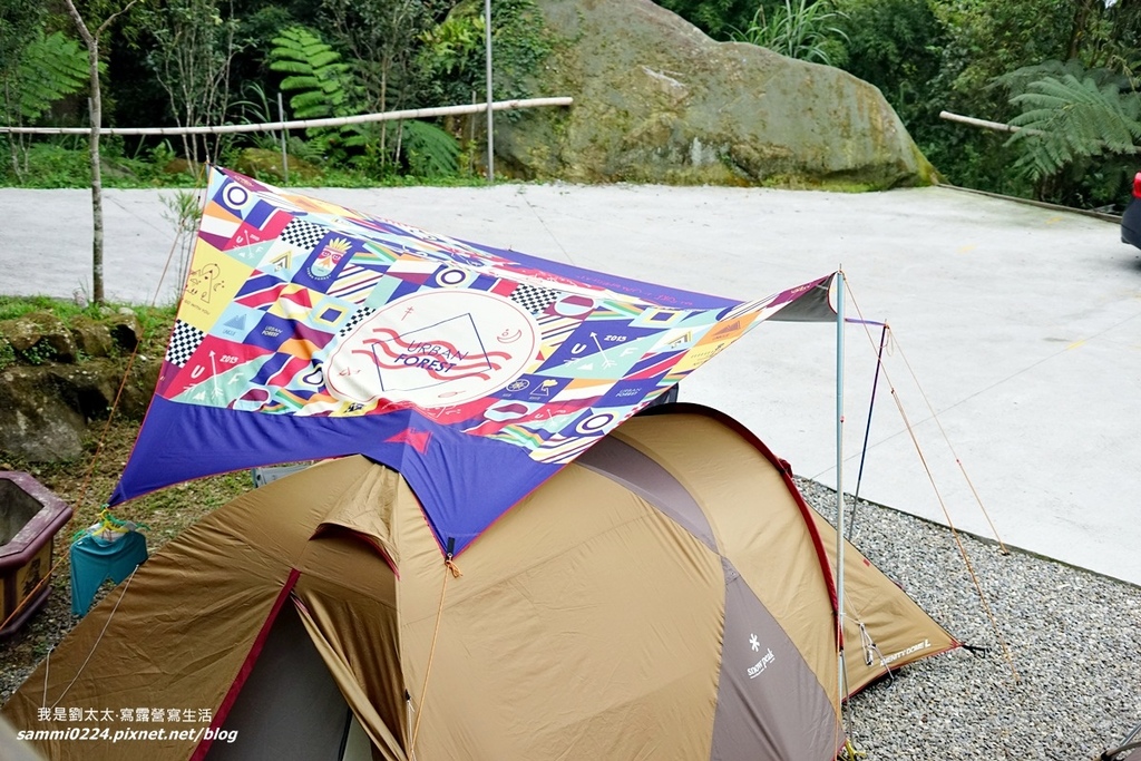 靠近樹林的區域,有四個棧板,不過搭上帳篷後,就沒位子放天幕,所以我們將其中一個棧板用來做為天幕的客廳區域。
