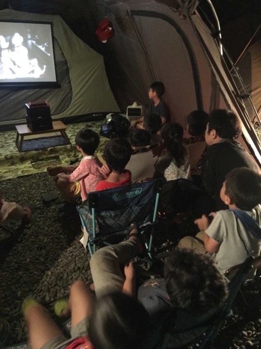 晚上大夥兒一起在露天電影院看影片。