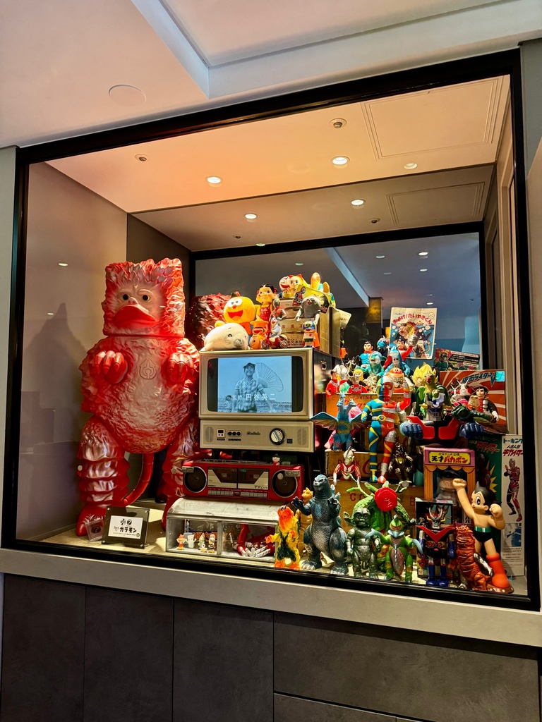 用喫茶店和復古公仔以及復古遊戲機為主題,還有一整面牆的吉卜力繪畫手稿。
