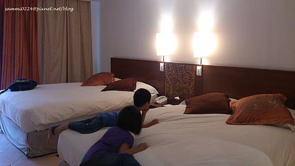 辦理住房手續時,我偷偷詢問是否有升等的可能,沒想到我們很幸運,櫃檯人員就幫我們升等到四人房兩張中床的房型。
